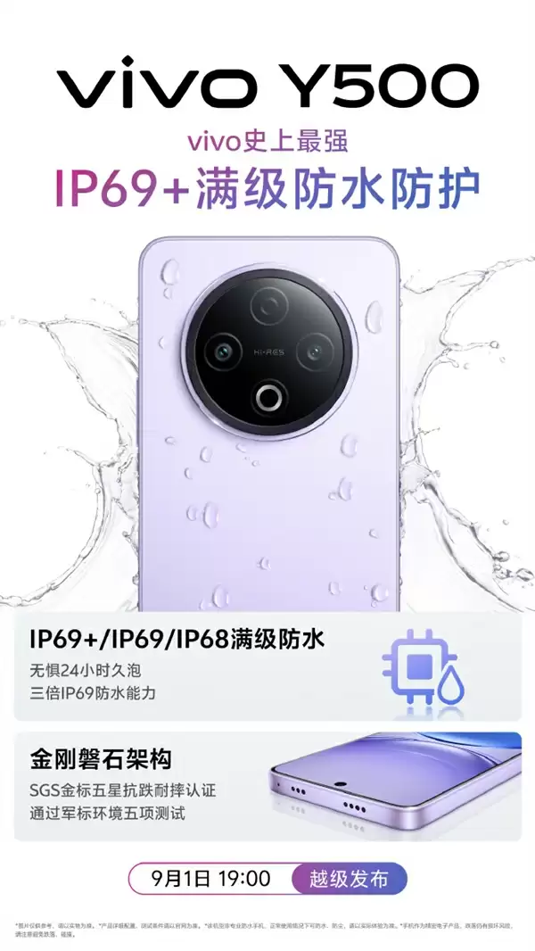 除了大电池,Y500防水技能也点满了,支持IP69+、IP69、IP68,是vivo史上最强防水,24小时久泡无压力。