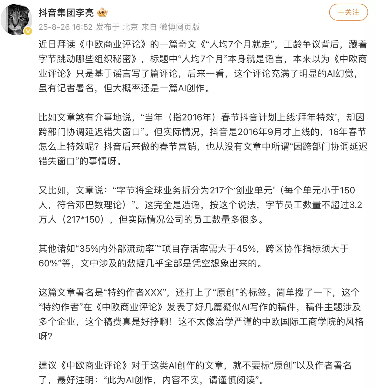 针对署名评论文章,李亮进一步指出,文中多处表述存在明显错误,很可能是一篇由AI生成的内容。除了澄清离职数据的谬误外,他还对文章中的其他失实之处一一做了回应。