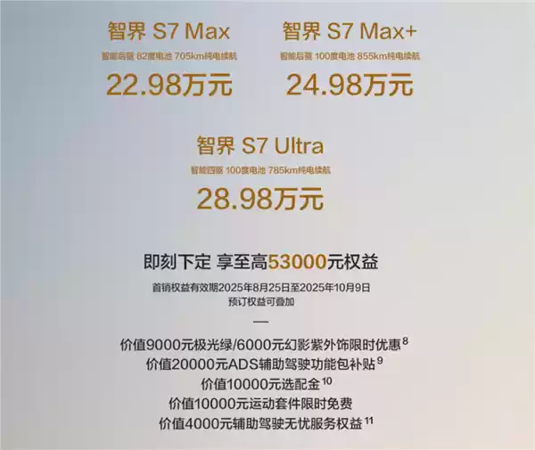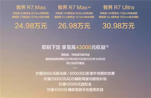 依旧是分成纯电和增程两个动力,智界 R7 这回砍掉了没有激光雷达的 Pro 版本,直接从 Max 起跳,分成了 Max 、Max+、Ultra 三个版本,分别定价 24.98 万、26.98 万 以及 30.98 万,对应了后驱、后驱大电池和四驱大电池。