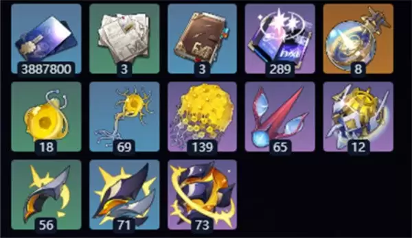 二、天赋材料信用点×3887800旅情见闻×3冒险记录×3漫游指南×289命运的足迹×8思量的种×18末那芽苗×69阿赖耶华×139海妖残鳍×65预兆似有若无×56悲鸣由远及近×71哀叹漫无止息×73