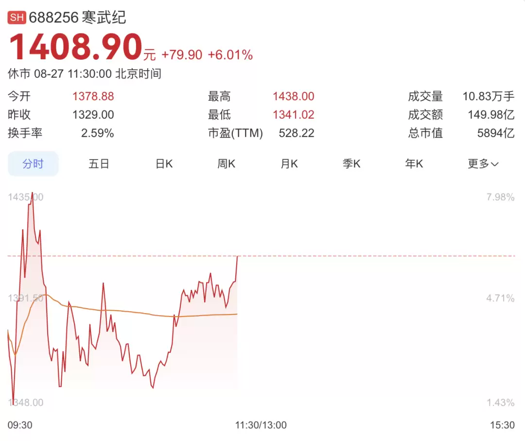 五天后,8月27日,寒武纪再次大涨超8%,股价突破1400元/股,摸高至1438元/股,总市值达到5700多亿元,这意味着在很短的交易日内,寒武纪市值连续大幅攀升。