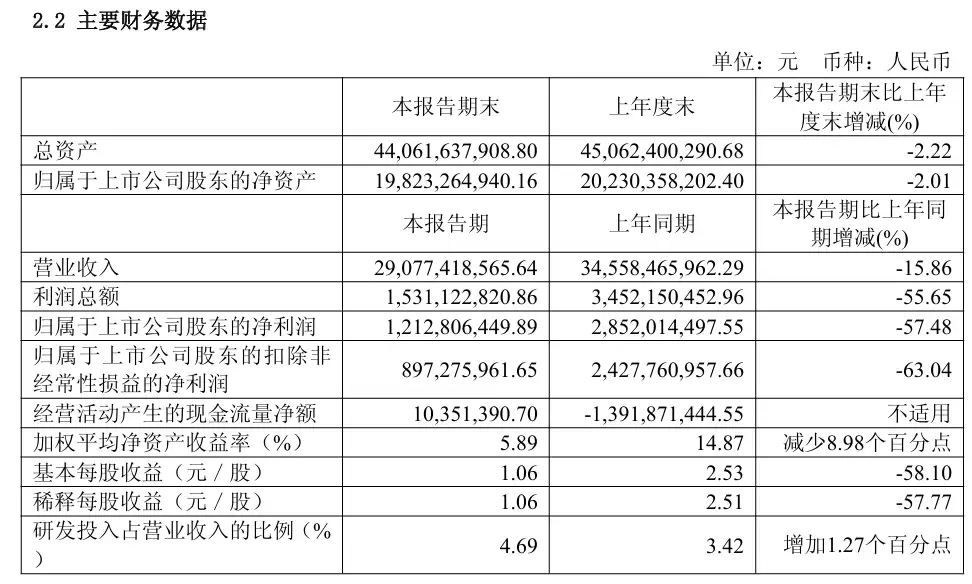 - 归属于母公司股东的净利润录得12.13亿元,较上年同期下降57.48%;