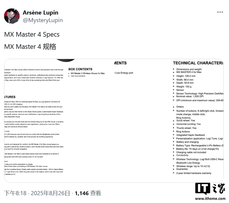 8 月 27 日消息,科技媒体 Winfuture.de 昨日(8 月 26 日)发布博文,曝料称罗技将于 2025 年 9 月 30 日推出高端无线鼠标 MX Master 4,售价 129.99 欧元(注:现汇率约合 1085 元人民币),并分享了一组渲染图。该鼠标的目标群体为专业创意人士与高效办公人群,新款在设计与功能上均有重大升级。