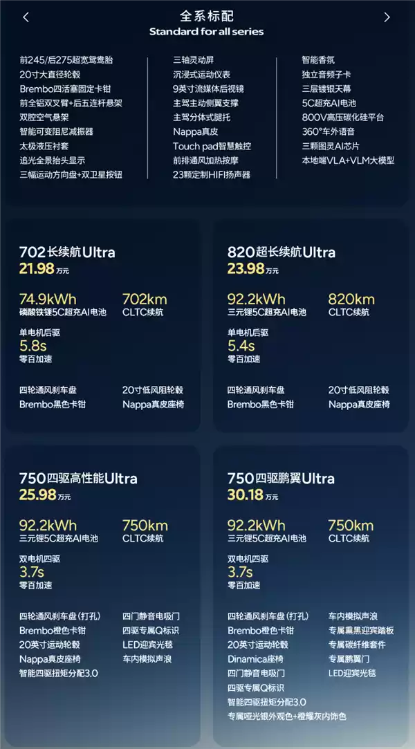 入门版就给了很多配置,有800V平台、5C电池、双腔空悬、可变阻尼、HUD,还有23扬声器,座椅腿托、侧翼等等,包括智驾配置,也是全系一样。这才是它敢自称Ultra的底气吧。
