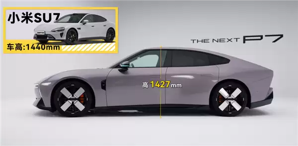 移到侧面,咱会发现P7很低趴。它的标准车高是1427mm,比小米SU7还要低。