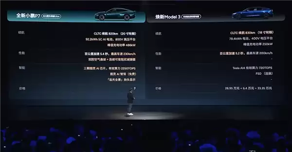 新P7的入门是74.9度磷酸铁锂,CLTC 702km;中配是92.2度三元锂,CLTC 820km;高配和中配电池一样,但是四驱,CLTC 750km,然后多了电吸门、打孔盘、迎宾光毯等配置;鹏翼版再多了鹏翼门、运动座椅和碳纤维套件。