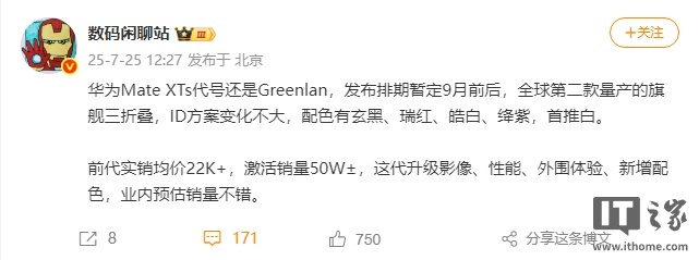 他还提到,华为 Mate XT 实销均价 2.2 万元以上,激活销量在 50 万部左右,而 Mate XTs 对影像、性能、外围体验进行了升级,还有新配色,预估销量更高。