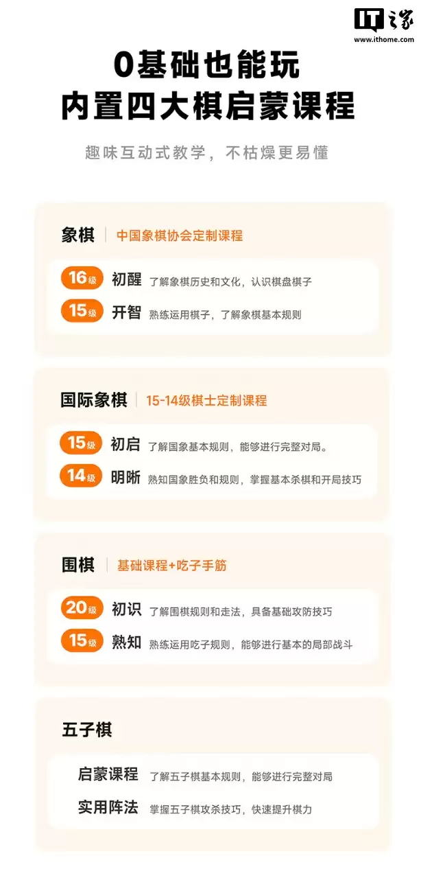 这款机器人具备学编程、下象棋、围棋、国际象棋、五子棋功能,其中编程教学使用卡片化设计,号称“0 基础也能玩”,配有 47 张实体卡片,可控制机器人跳舞,还可让机器人化身抓娃娃机,用机械臂抓取棋子。