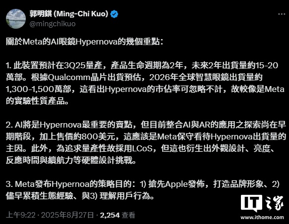 郭明錤在其社交媒体上表示,根据高通芯片出货预估,2026 年全球智能眼镜出货量将达到 1,300-1,500 万部。因此 Hypernova 的市占率可忽略不计,该产品更像是 Meta 的实验性产品。