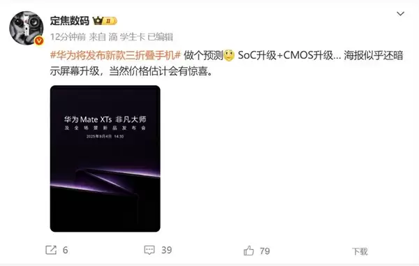博主定焦数码表示,华为Mate XTs非凡大师的Soc和影像传感器迎来升级,海报似乎还暗示屏幕升级,当然价格会有惊喜。