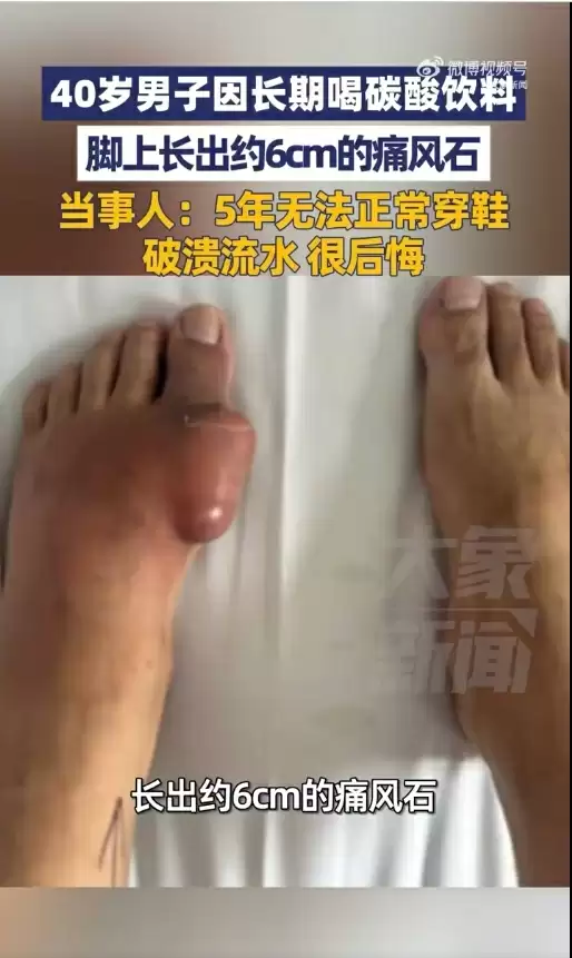 40岁男子长期喝碳酸饮料致痛风,脚部6cm结石5年无法穿鞋