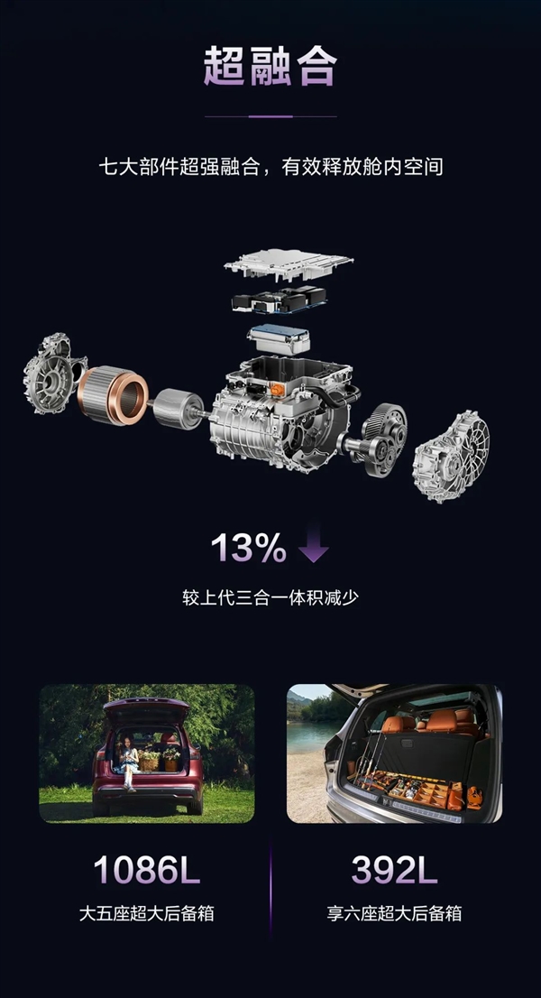 这款电驱采用高度集成设计,七大部件融合,体积较上一代三合一减少 13%,可有效释放舱内空间,节约30%座舱与后备箱空间,为车辆内部布局提供了更多灵活性。