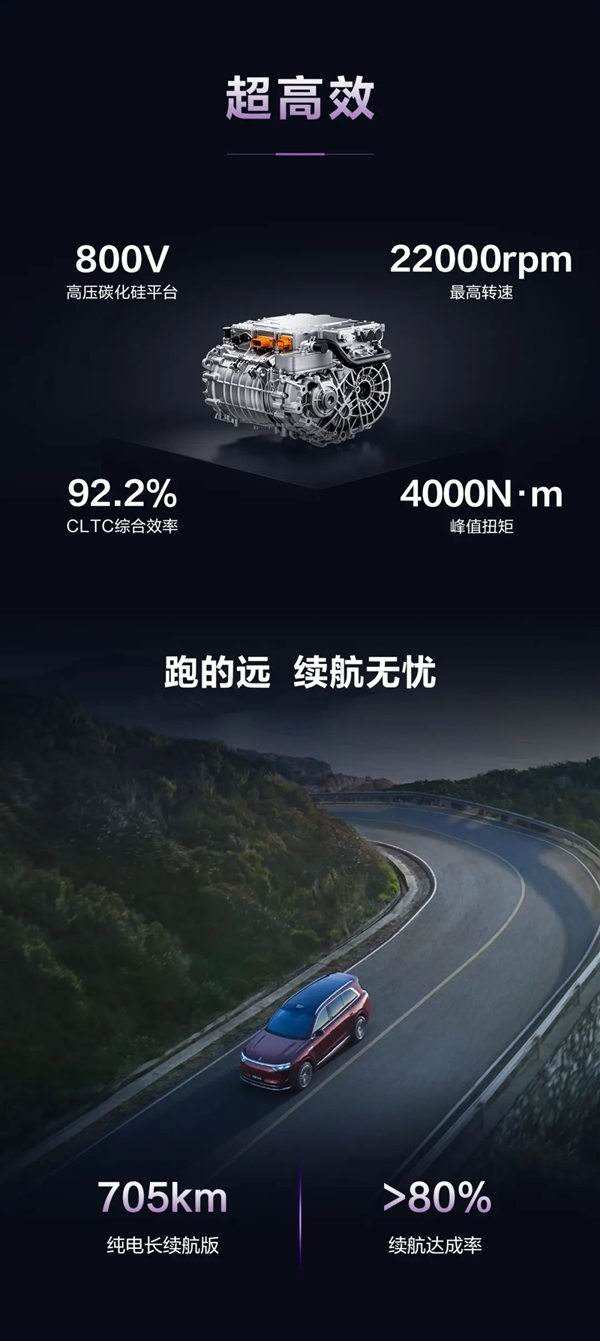 采用0.2mm超薄硅钢片、华为自研碳化硅模组、磁钢胶粘工艺等技术,确保了整车续航和动力,CLTC综合效率92.2%,有助于提升车辆的续航里程。