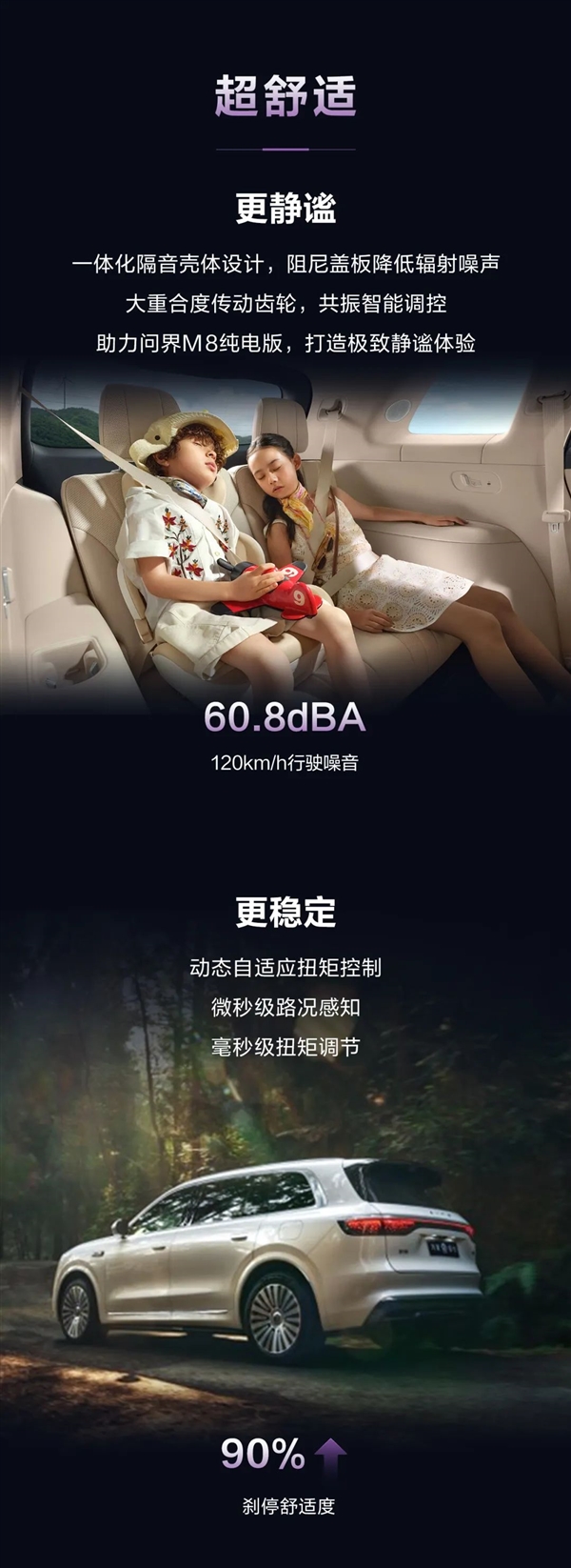 使用一体隔音壳体设计,阻尼盖板可降低辐射噪声,大重合度传动齿轮,共振智能调控,120km/h行驶噪音仅60.8dBA。