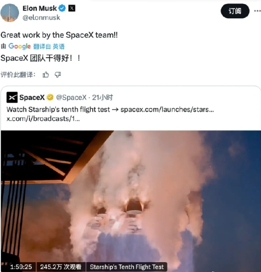 随后,马斯克在X上发文表示:“SpaceX团队干得好!”