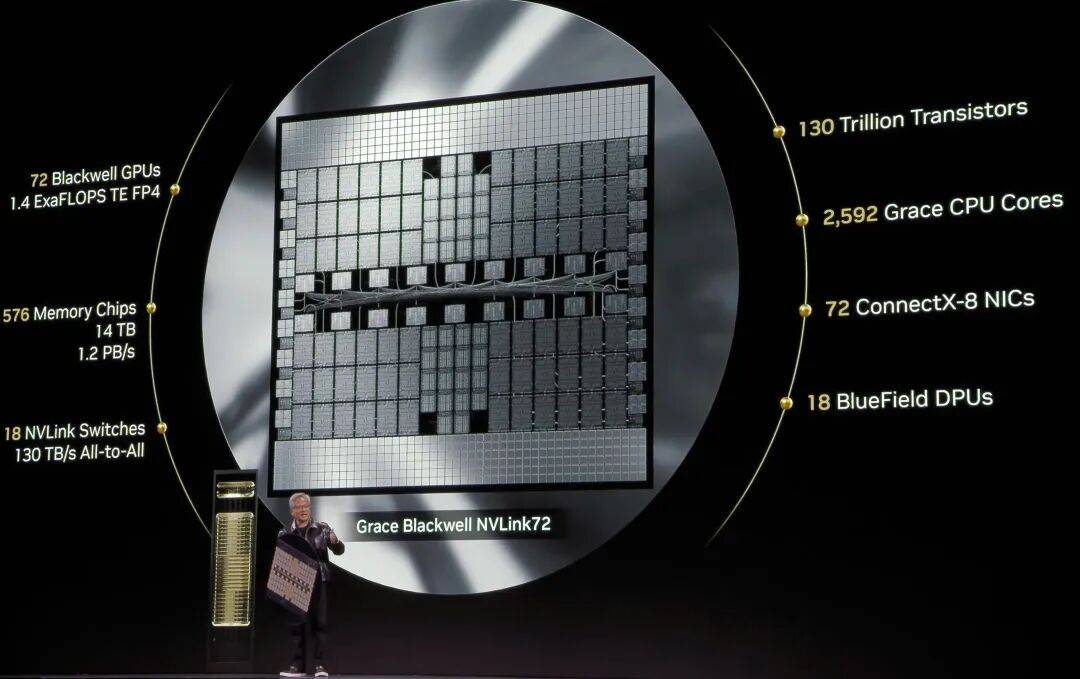 英伟达花费数年时间打造了Blackwell NVLink 72系统——一种机架级计算平台,使其能够作为一个单一的巨型GPU运行。