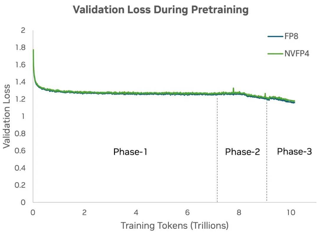 实验结果显示,在120亿参数的Mamba-Transformer混合模型上,NVFP4能完整训练到10万亿token,收敛效果几乎与FP8一致,下游任务测试精度也基本相同。