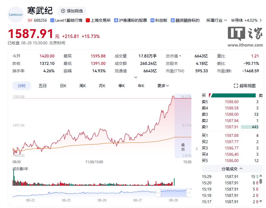 8 月 28 日消息,继前一天仅短暂 20 分钟“称王”后,寒武纪今日股价大幅收涨 15.73%,收于 1587.91 元 / 股,总市值达到 6643 亿元。值得注意的是,寒武纪当日收盘价超越贵州茅台的收盘价格 1446.1 元 / 股,正式位居 A 股第一。