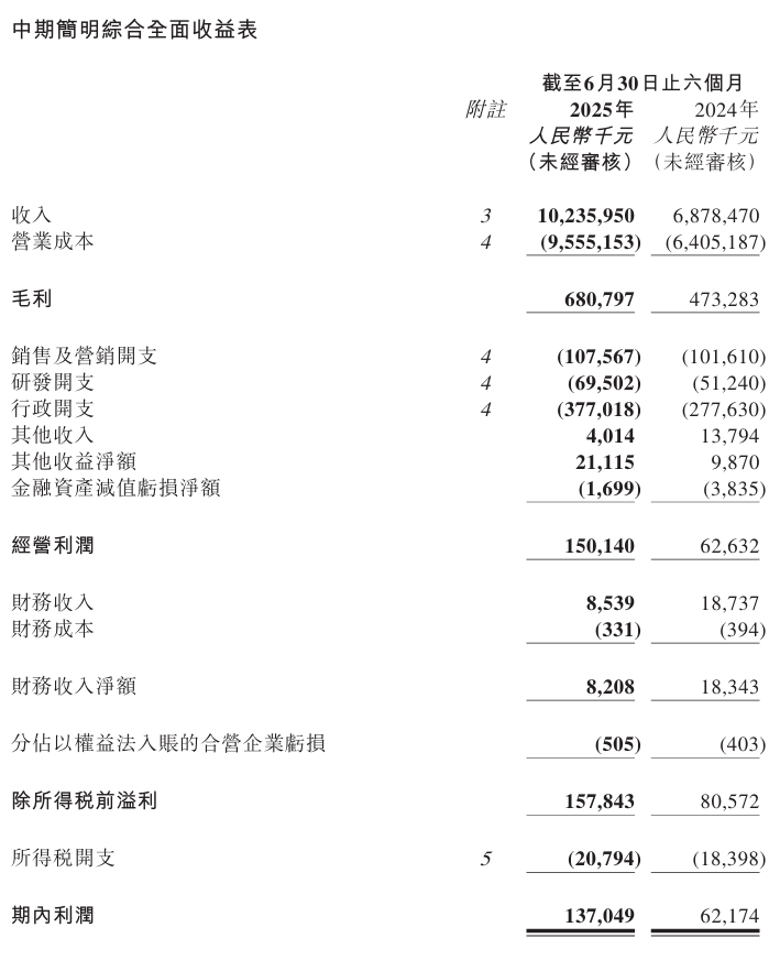 截至 2025 年 6 月 30 日止六个月,该公司的经调整净利润及经调整净利润率分别为人民币 1.60 亿元及 1.6%;而截至 2024 年 6 月 30 日止六个月,经调整净利润及经调整净利润率则分别为人民币 0.67 亿元及 1.0%。经调整净利润同比增长 139.0%。
