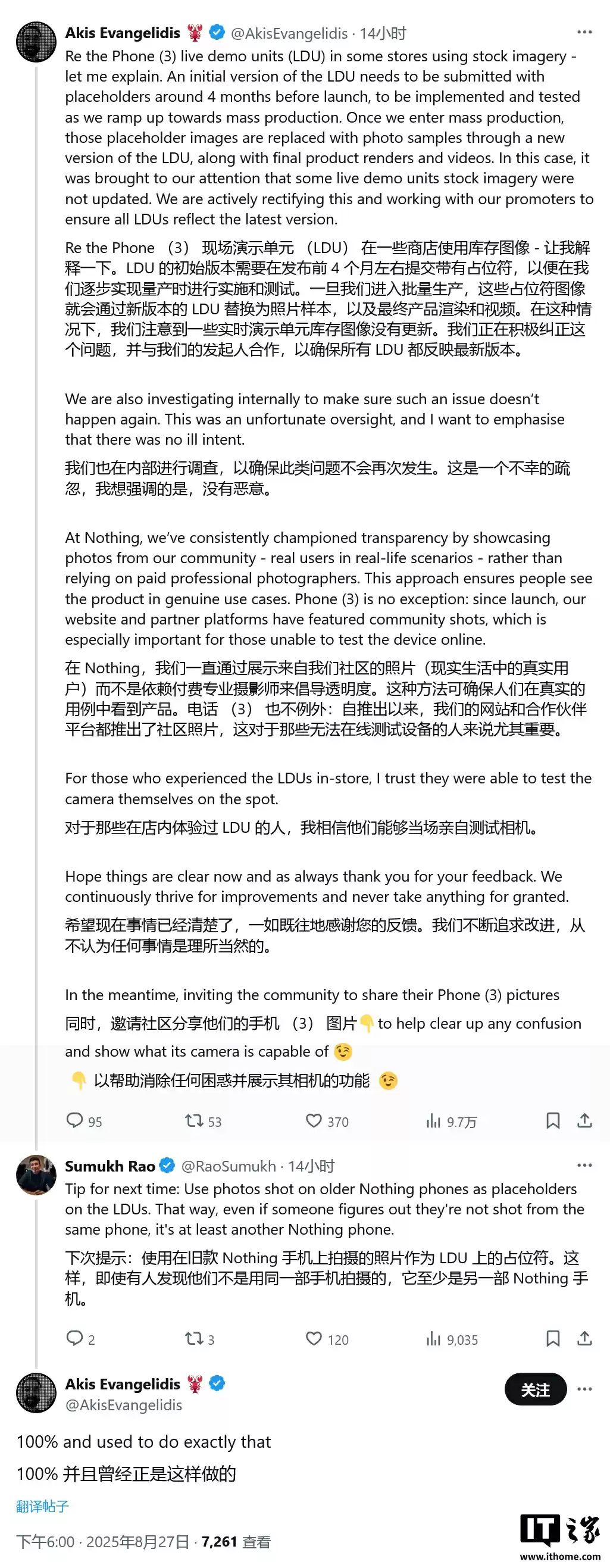面对舆论质疑,Nothing联合创始人Akis Evangelidis在社交平台X上公开致歉,将其称为“令人遗憾的疏忽”。他解释道,演示软件需在四个月前提交初版,原本计划在量产阶段将占位图替换为实拍样张,但部分展示设备未能及时更新。他表示公司已启动内部调查程序,将确保此类问题不再重现。