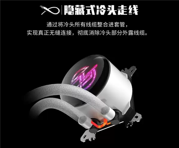 该水冷还采用隐藏式冷头走线与磁吸式简易盖板设计,实现无缝视觉效果,搭配预装风扇的隐藏线缆设计,进一步凸显风扇的ARGB灯效。