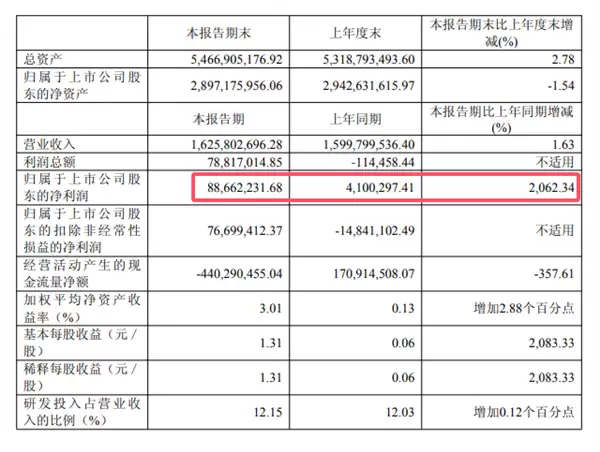 归属于上市公司股东的净利润8866.22万元,同比去年同期的410万元暴增2062.34%。