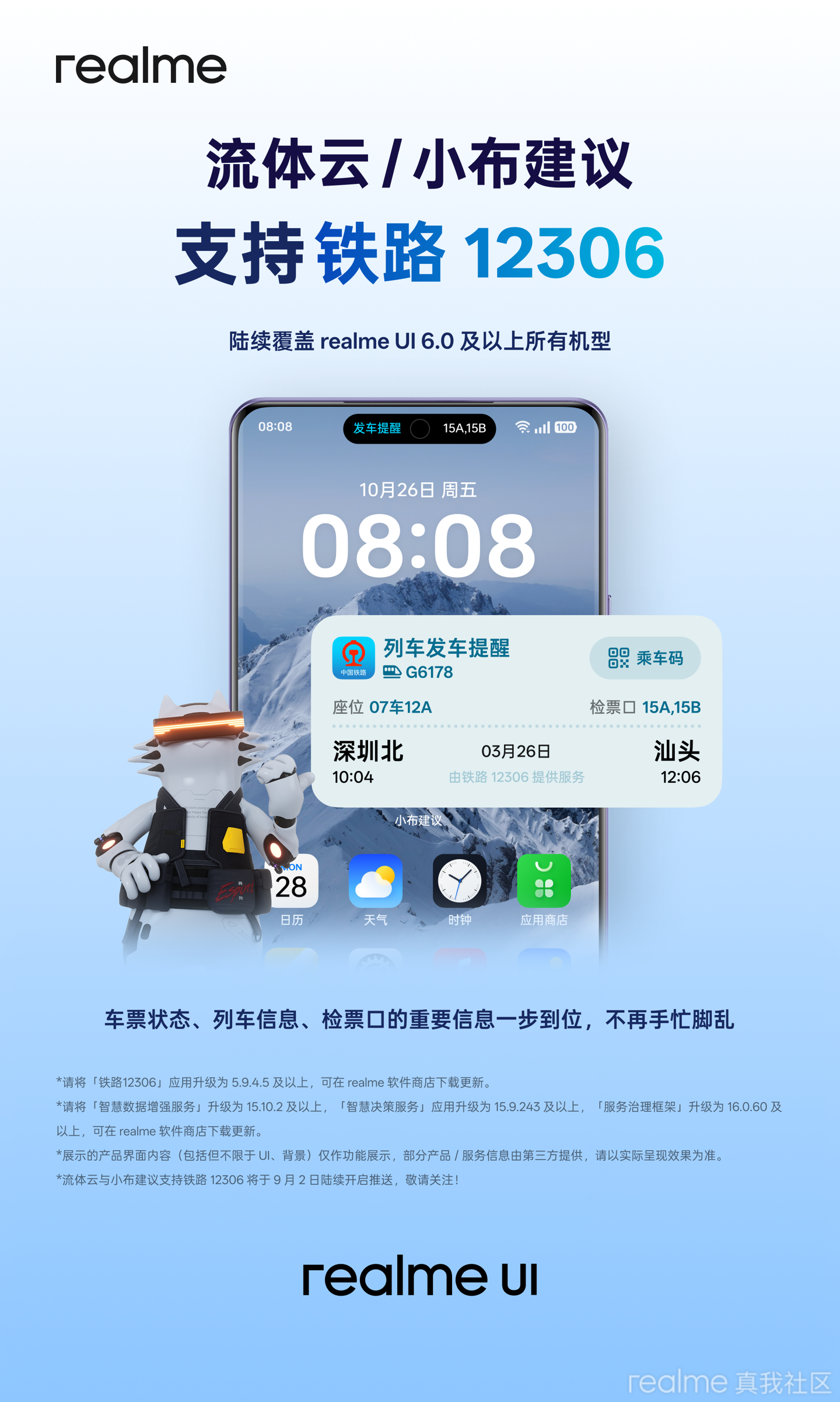 8 月 29 日消息,真我 realme 宣布旗下 realme UI 6.0 流体云 / 小布建议正式接入中国铁路 12306 App,相应功能将于 9 月 2 日陆续开启推送,可一步到位显示车票状态、列车信息、检票口等资讯。