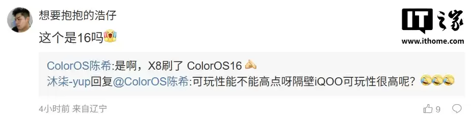 ”,陈希回复道:“嗯,优化了”;另一名用户则询问:“这个是 16 吗”,博主则回复道:“是啊,X8 刷了 ColorOS16