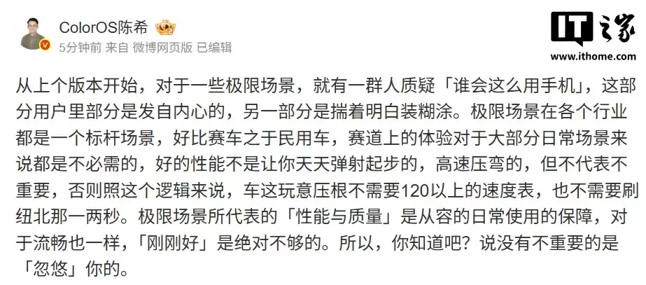 从上个版本开始,对于一些极限场景,就有一群人质疑“谁会这么用手机”,这部分用户里部分是发自内心的,另一部分是揣着明白装糊涂。极限场景在各个行业都是一个标杆场景,好比赛车之于民用车,赛道上的体验对于大部分日常场景来说都是不必需的,好的性能不是让你天天弹射起步的,高速压弯的,但不代表不重要,否则照这个逻辑来说,车这玩意压根不需要 120 以上的速度表,也不需要刷纽北那一两秒。极限场景所代表的“性能与质量”是从容的日常使用的保障,对于流畅也一样,“刚刚好”是绝对不够的。所以,你知道吧?说没有不重要的是“忽悠”你的。
