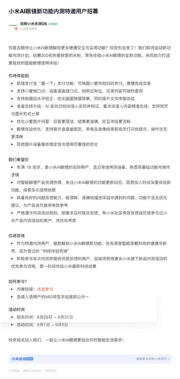 8月29日消息,小米官方今天发布公告,开启小米AI眼镜新功能内测特邀用户招募。