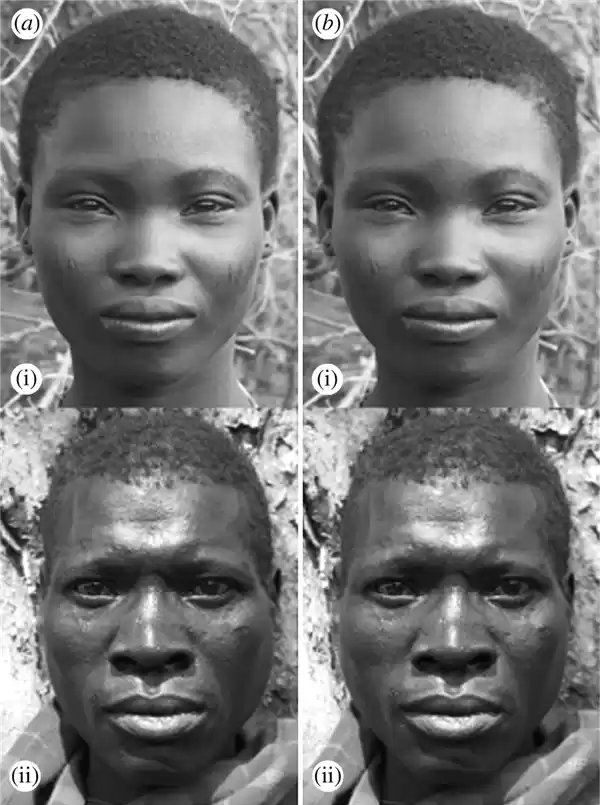 如图展示了Hadza族男性与女性面孔的例子:a(i, ii) 为经过对称处理的脸,b(i, ii) 则为原始未处理的脸。图片来源:参考文献[14]
