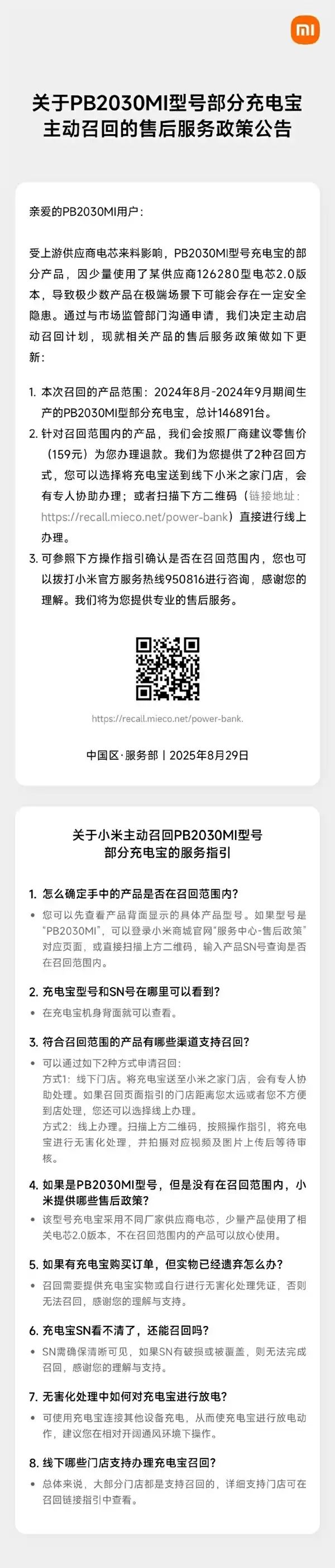 8月29日,小米官方发布产品召回公告,决定对型号为PB2030MI的部分充电宝实施自愿召回计划。