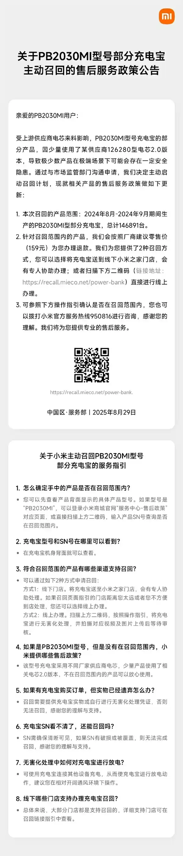 8月29日最新消息,小米公司今日正式发布针对PB2030MI型号部分充电宝的召回公告。