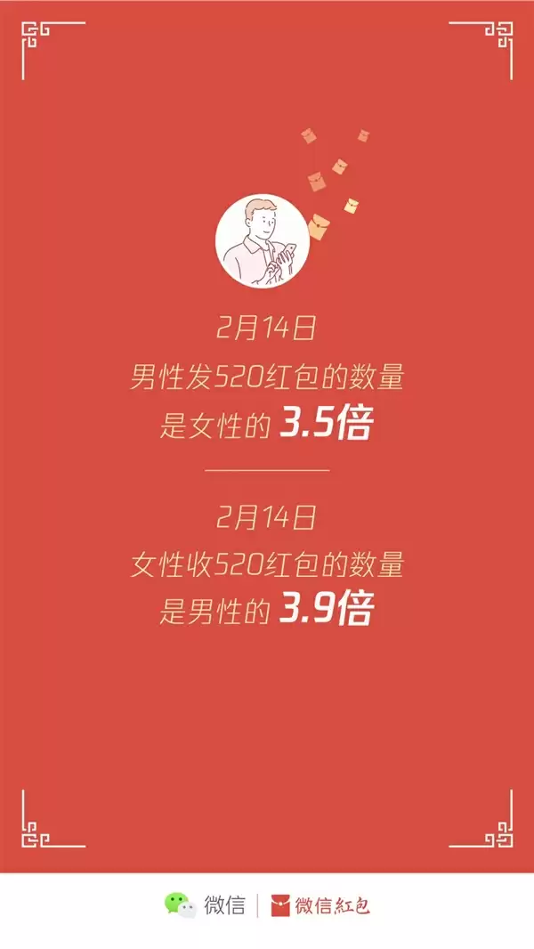 有意思的是,男性用户发送520红包的数量是女性的3.5倍,而女性收取520红包的数量则达到男性的3.9倍。