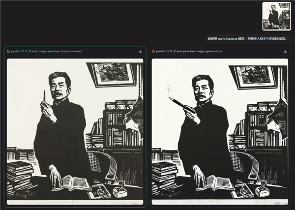 再比如让鲁迅不要抽烟改拿笔,右边这个细节变了一堆不说,笔头还冒着烟呢。