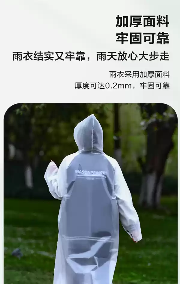 整件雨衣牢固耐用,雨天也能安心迈步。加厚面料厚度达到0.2毫米,最高可承受20牛顿的拉力强度,轻松适应各类使用场景。