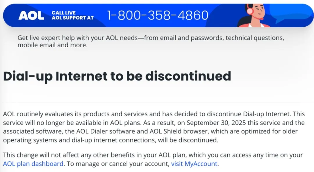 AOL 没有正式宣布拨号上网停服,而是在客服页面上低调地写了几段话