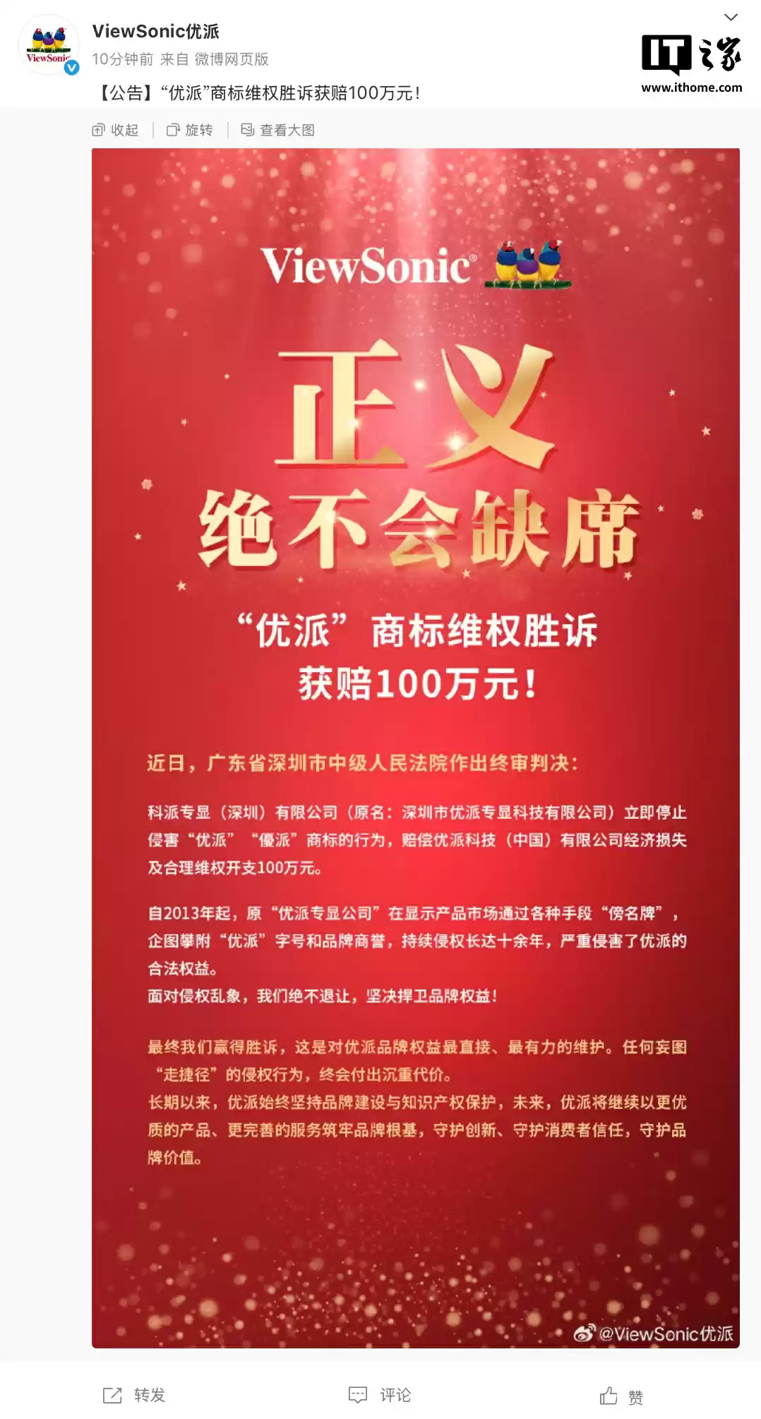 8 月 31 日消息,据显示器制造商“ViewSonic 优派”官方微博,近日,广东省深圳市中级人民法院作出终审判决,要求科派专显(深圳)有限公司(原名:深圳市优派专显科技有限公司)立即停止侵害“优派”、“優派”商标的行为,赔偿优派科技(中国)有限公司经济损失及合理维权开支 100 万元。