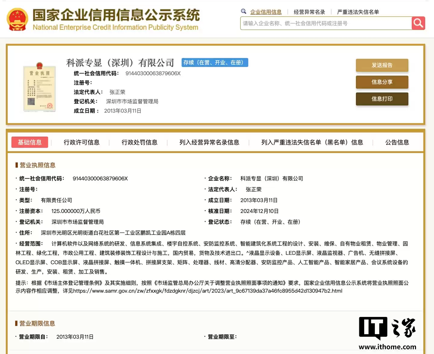 查询国家企业信用信息公示系统获悉,“科派专显(深圳)有限公司”于 2013 年 3 月 11 日成立,注册资本 125 万元人民币。经营范围包括液晶显示设备、LED 显示屏、液晶监视器、广告机、无缝拼接屏、OLED 显示屏、COB 显示屏、液晶拼接屏、触摸一体机、拼接屏支架、矩阵、处理器、线材、高清分配器、安防监控产品、人工智能产品、智能家居产品、会议系统设备的研发、生产,安装、租赁、加工及销售等。