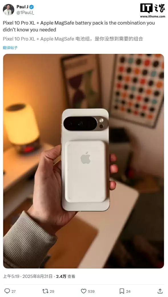 意想不到的是,在这款 MagSafe 外接电池停售近两年之后,有用户发现它不仅能支持 iPhone 磁吸充电,如今也能用在谷歌新推出的 Pixel 10 Pro 手机上。