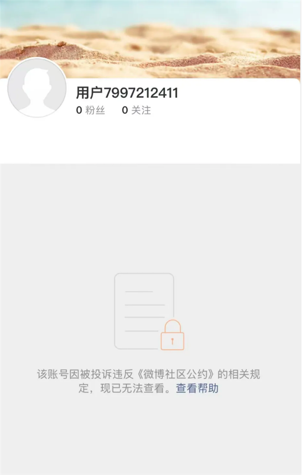 页面显示,“该账号因被投诉违反《微博社区公约》的相关规定,现已无法查看”。