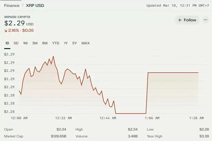 截至2025年3月18日,XRP现报2.29美元,24小时跌幅2.16%,较前收盘价2.34美元下跌0.05美元。盘中价格维持在2.28-2.34美元区间窄幅波动。当前XRP市值维持在1286.5亿美元,24小时交易量达34.8亿美元,显示出良好的市场流动性和持续的投资者参与度。