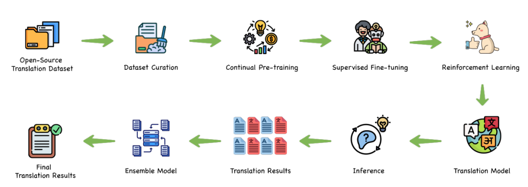 腾讯混元还称,在业界常用的翻译能力测评数据集 Flores200 上,腾讯混元 Hunyuan-MT-7B 模型也有卓越的效果表现,明显领先于同尺寸模型,与超大尺寸模型效果对比也不逊色。针对翻译场景,腾讯混元提出了一个完整的翻译模型训练范式,覆盖从预训练、到 CPT 再到监督调参、翻译强化和集成强化全链条,使得模型的翻译效果达到业界最优。