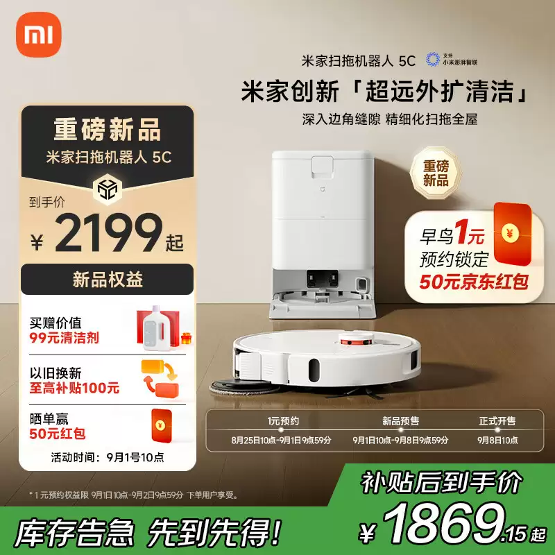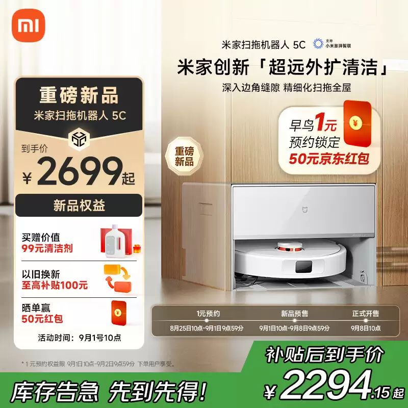 9 月 1 日消息,小米米家扫拖机器人 5C 将于今日 10 点开启预售,创新采用超远外扩清洁,拥有水箱版、薄嵌上下水版本可选,预售价分别为 2199 元(国补价 1869.15 元起)和 2699 元(国补价 2294.15 元起)。
