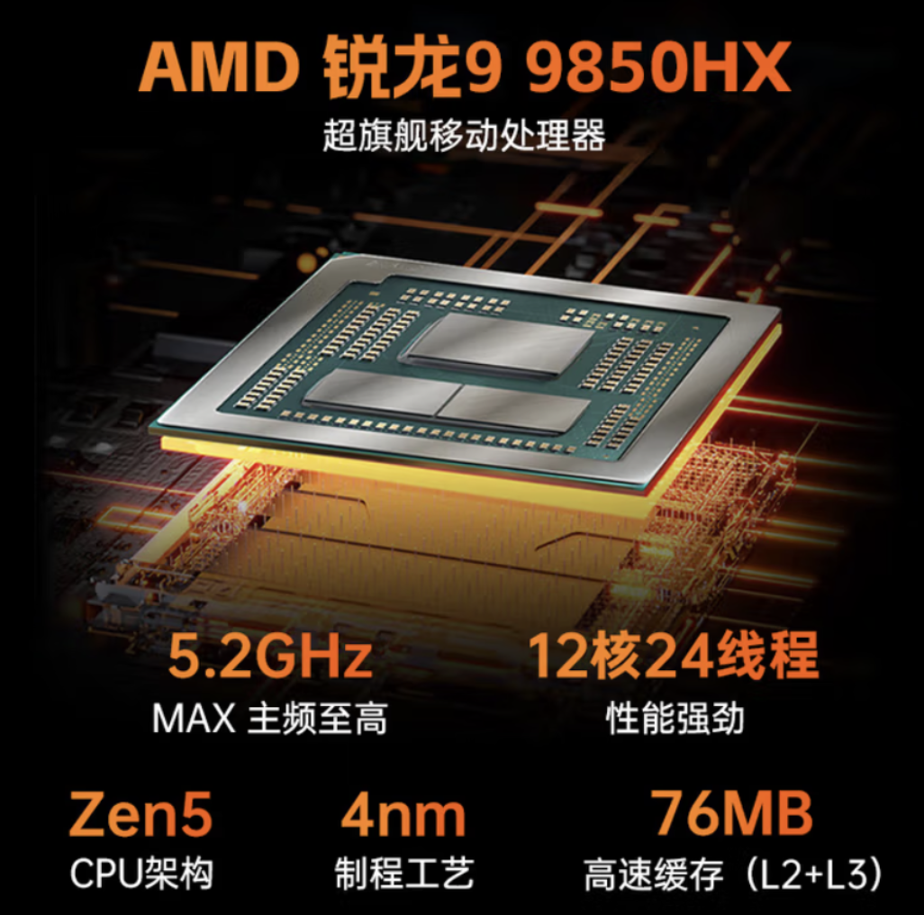硬件方面,这款游戏本采用基于 Zen 5 架构的 AMD 锐龙 9 9850HX 处理器,制程工艺为 4 纳米,搭配 12 核 24 线程,其主频最高可达 5.2GHz;可选英伟达 RTX 5060/5070 显卡,功耗均为 115W,均内置 8GB GDDR7 显存,支持 DLSS 4 多帧生成技术。