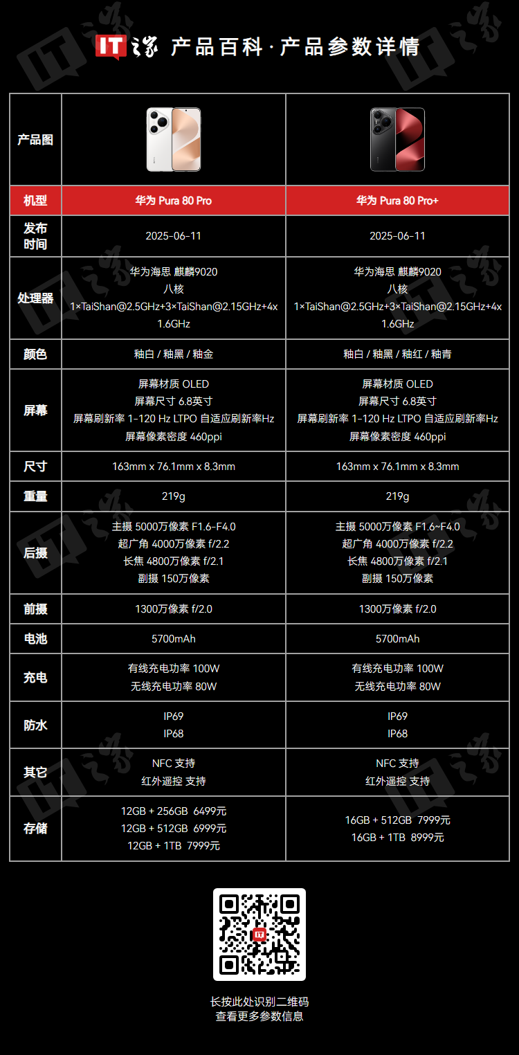 两者虽然都是一英寸主摄,但是 Pura 80 Pro + 版本拥有高动态范围,色彩、明暗还原更好。附产品对比: