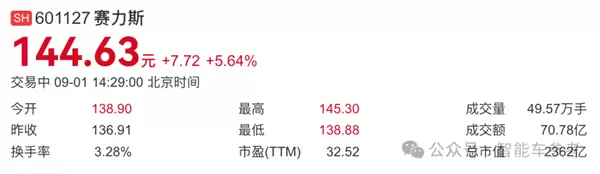 上半年业绩公布的第一个交易日,赛力斯股价一度大涨超5%,市值超2360亿元,成为中国市值TOP3车企,仅次于小米和比亚迪。