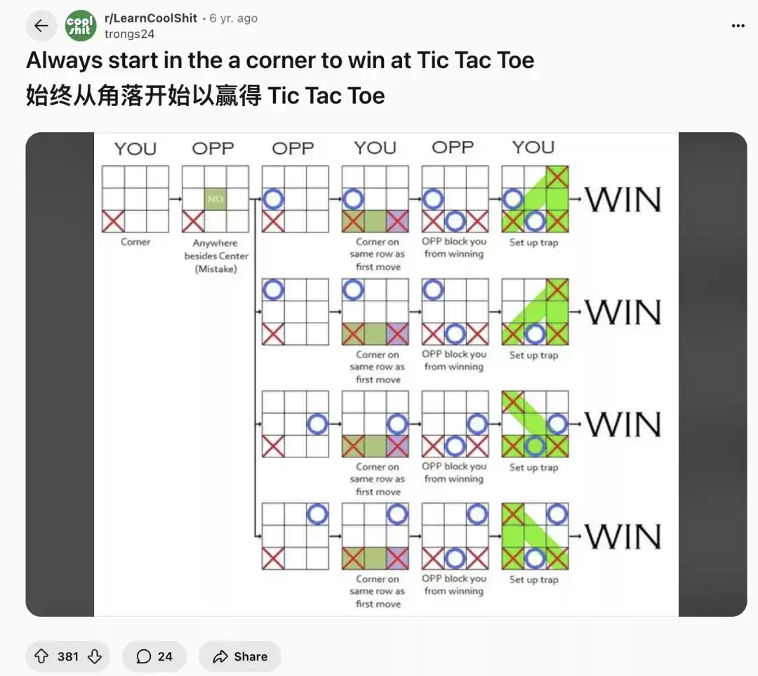 按照民间博弈论的常识,井字棋先落子在角落,获胜概率会更高。