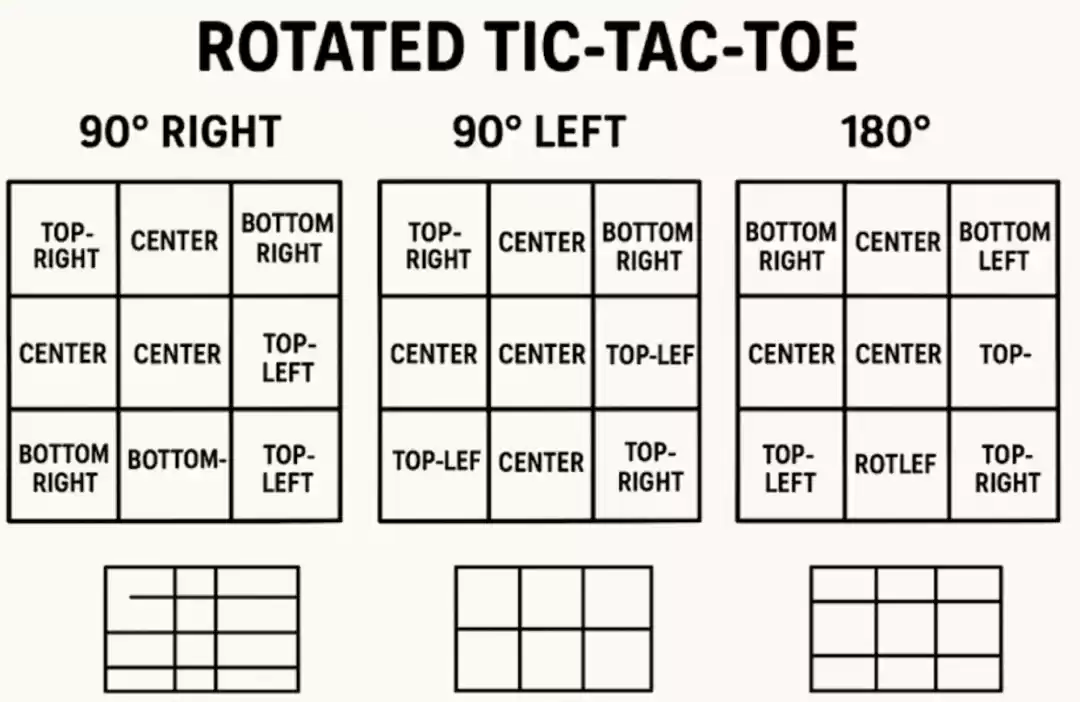 玩家们早已习惯了“直立”的井字棋棋盘,旋转可能会微妙地改变他们识别威胁与机会的方式。从数学角度看,将棋盘旋转 90 度并不会改变可能获胜的组合,就结果而言,它仍然是同一个游戏。但从心理层面来说,玩家的感受可能会有所不同。