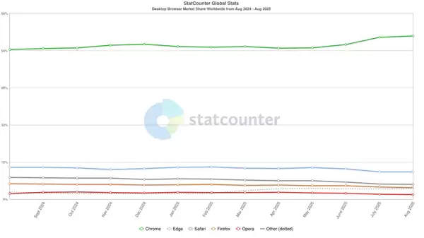 与Chrome相比,其最接近的竞争对手微软Edge的市场份额仅为11.8%(较上月增长了0.01个百分点)。